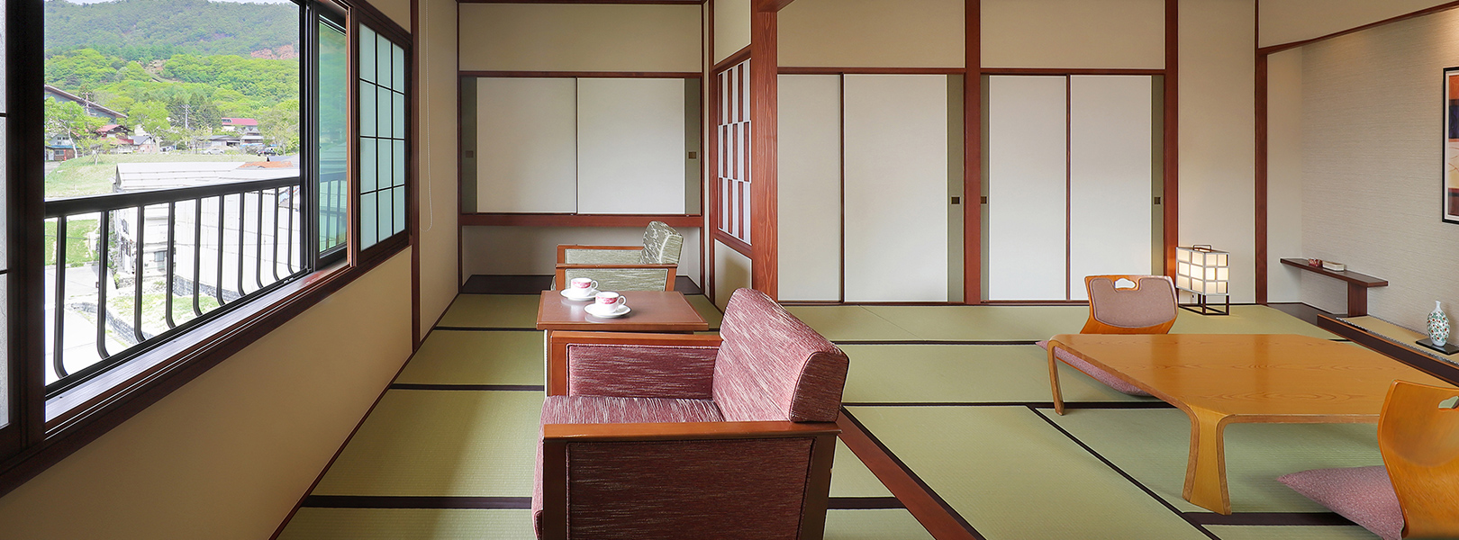 まるで蔵王の大自然の山懐に抱かれているような、そんな安らぎを感じていただけるような心でお迎えいたします。全てレトロな雰囲気の漂う大正モダンを感じさせるお部屋です。懐かしさが残るノスタルジックな雰囲気の中で、和室の落ち着きと洋室の快適さを、お好みでお楽しみください。